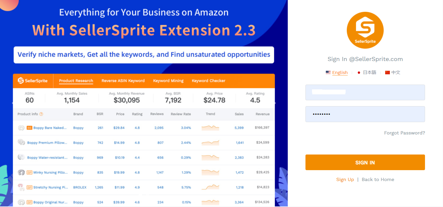IPアドレスとブラウザの特徴から、日本でご利用されていると判断をし、「セラースプライト-日本語版」をご利用ください。